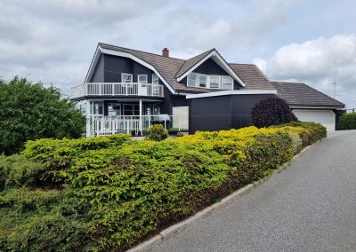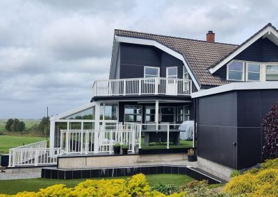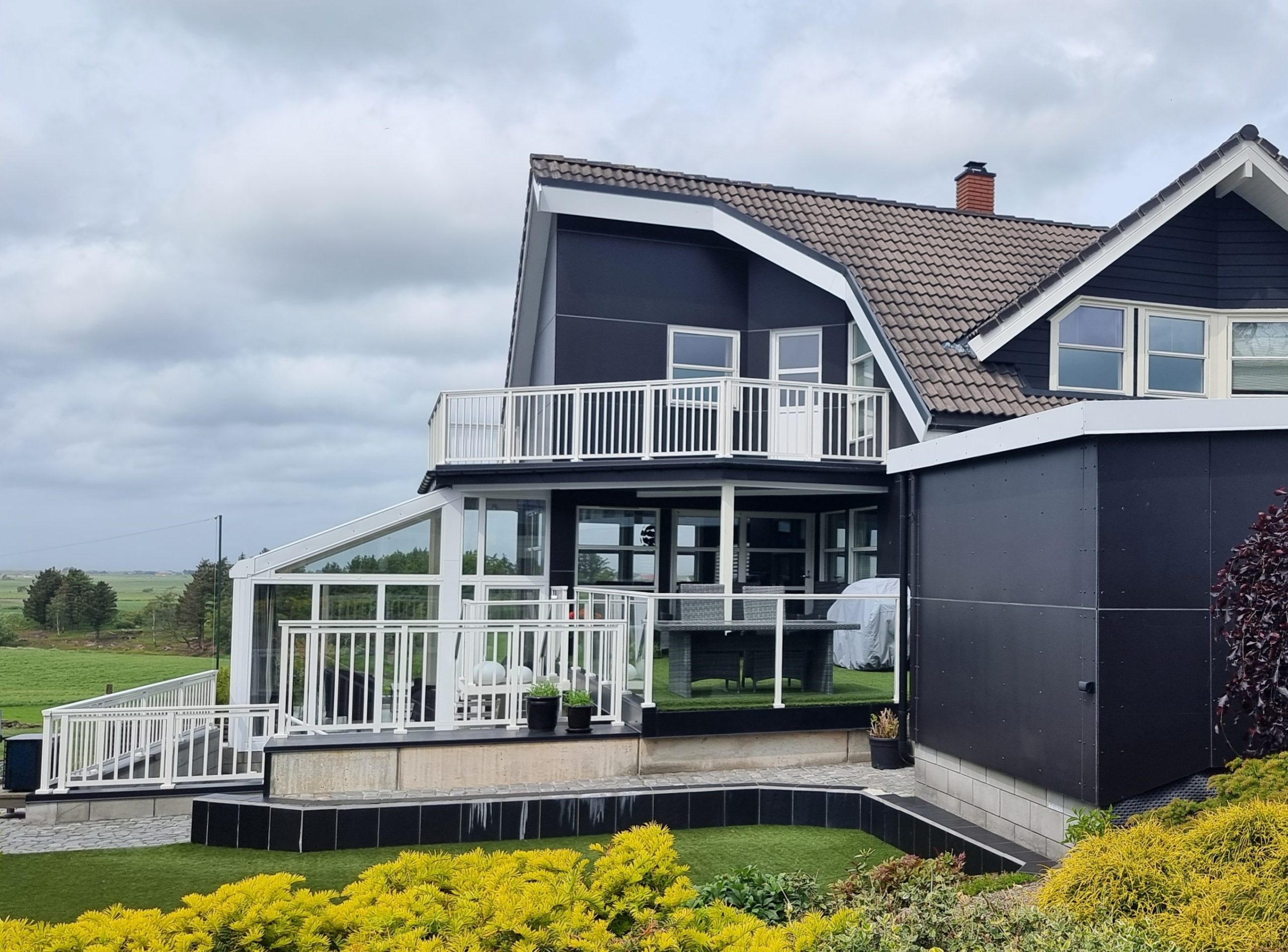 Prosjektet omfatter en enebolig med en ny hagestue og terrasse, samt en nedsenket uteplass under terrassen som gir en lun og skjermet sone uansett vær.