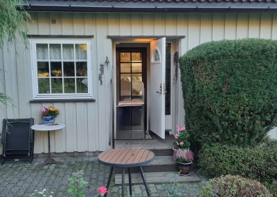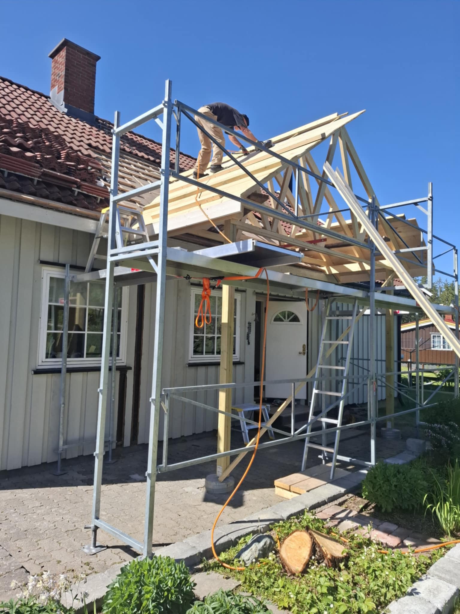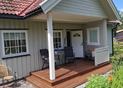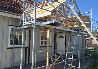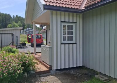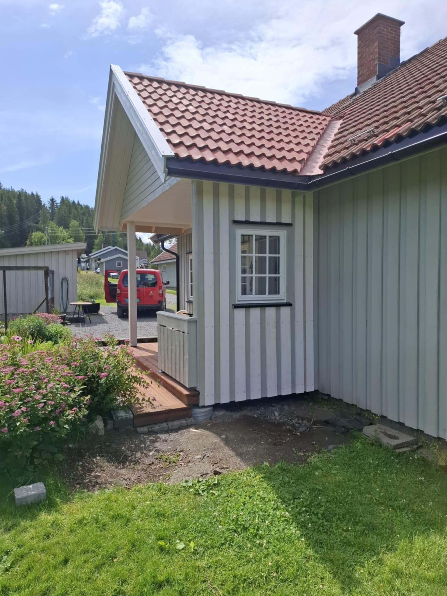 Kunden ønsket et overbygg ved inngangspartiet for å skjerme mot både sol og regn, samtidig som boligens opprinnelige uttrykk og takform ble ivaretatt. Løsningen ble videreutviklet til også å inkludere en større platting med plass til utemøbler, slik at inngangspartiet får en mer funksjonell og innbydende sone.