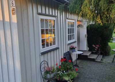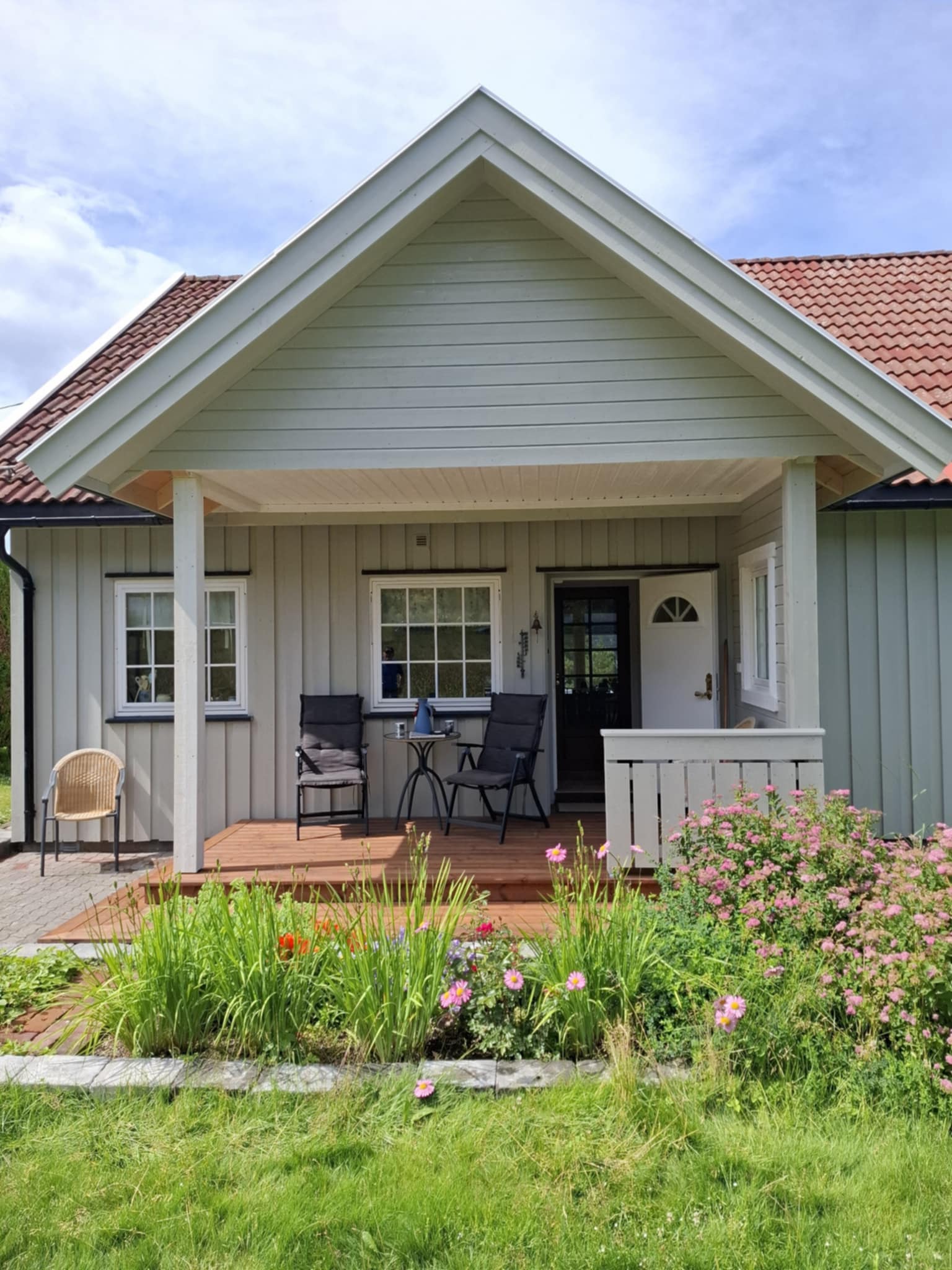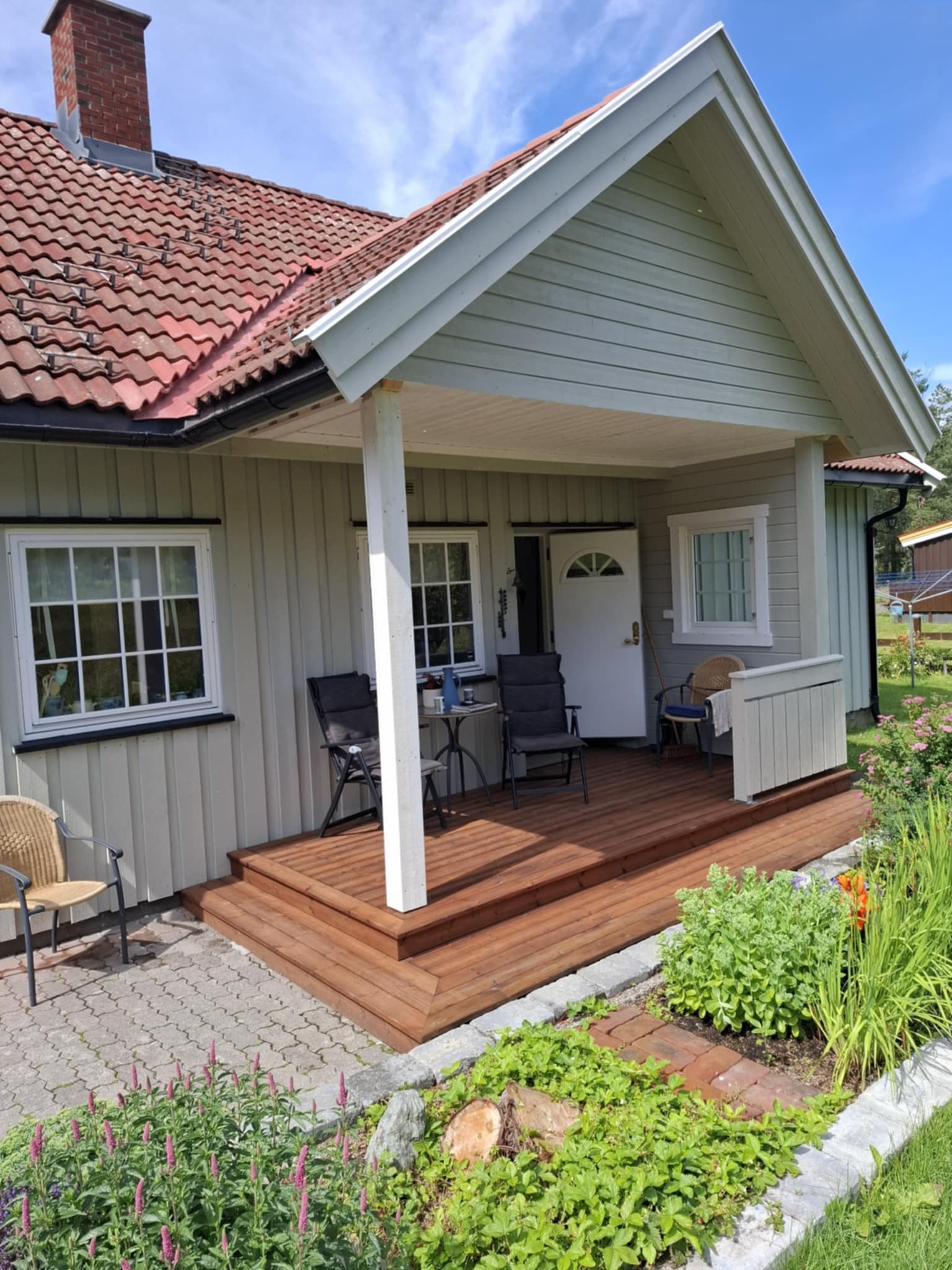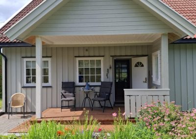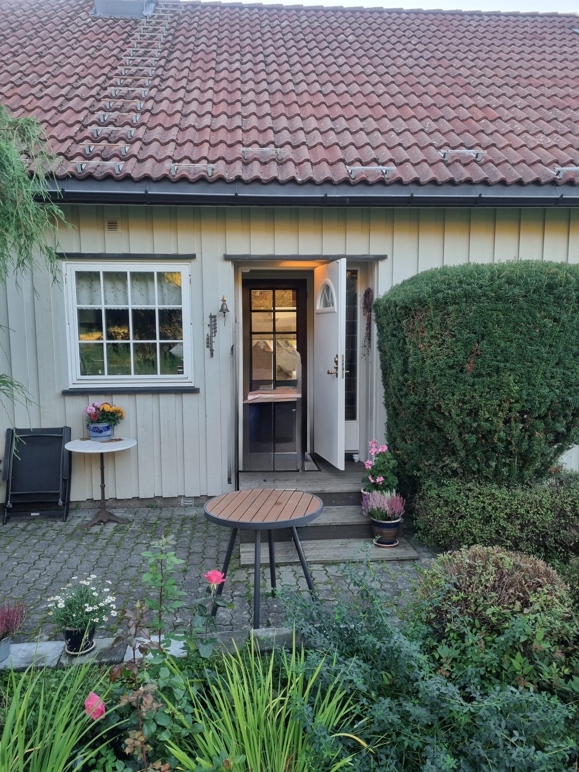 Kunden ønsket et overbygg ved inngangspartiet for å skjerme mot både sol og regn, samtidig som boligens opprinnelige uttrykk og takform ble ivaretatt. Løsningen ble videreutviklet til også å inkludere en større platting med plass til utemøbler, slik at inngangspartiet får en mer funksjonell og innbydende sone.