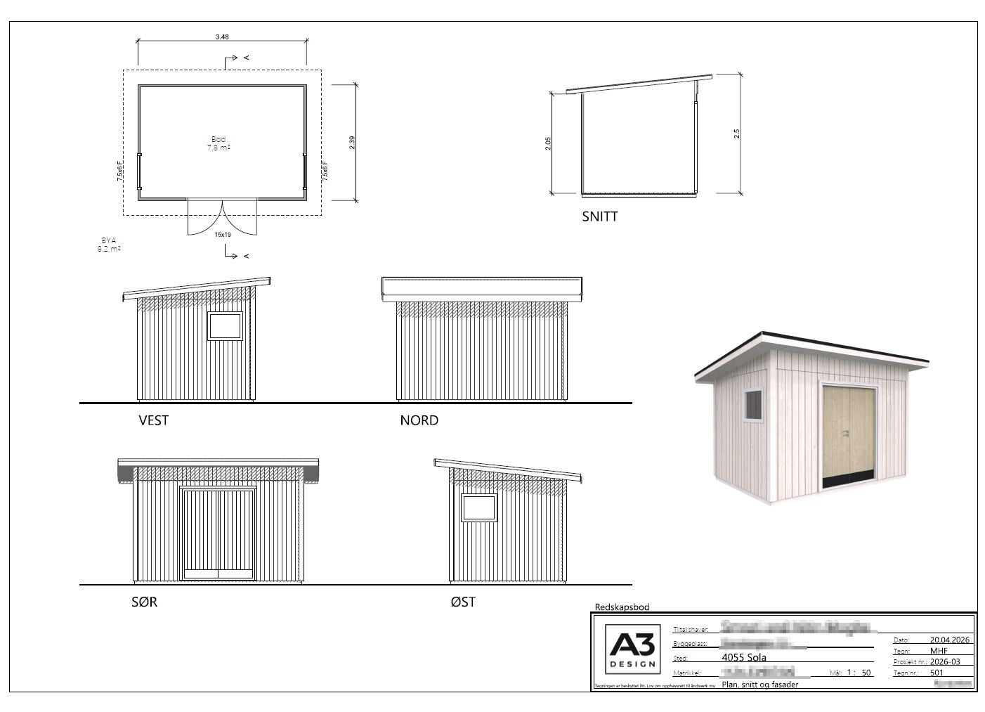 Dette er en ferdig bygget redskapsbod som skulle flyttes på tomten. Kommunen ønsket tegninger og situasjonskart. Det var kun mulig å finne monteringstegninger på nett, så da måtte boden tegnes opp. Vi kan bistå med alle typer jobber, ta gjerne kontakt for pris!